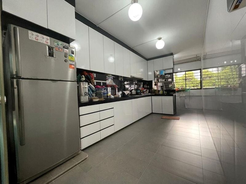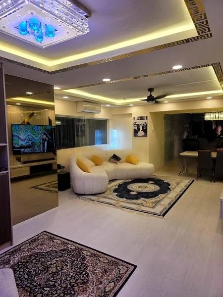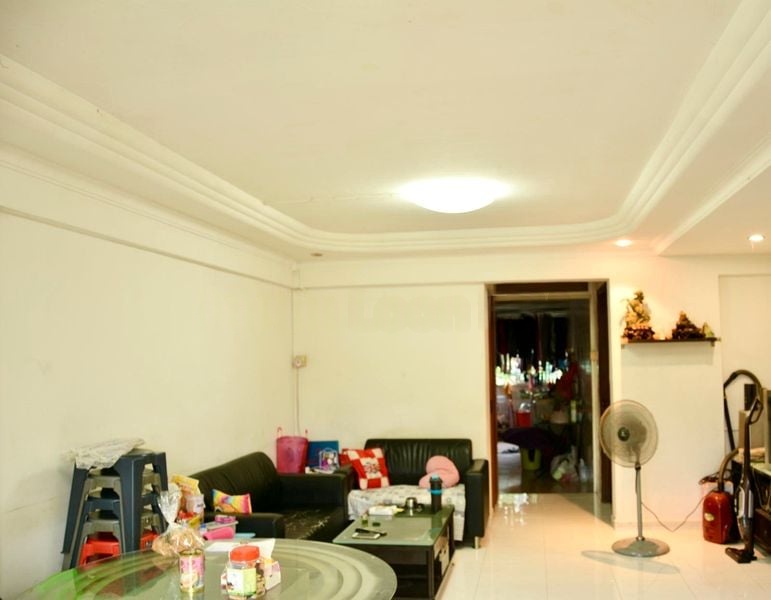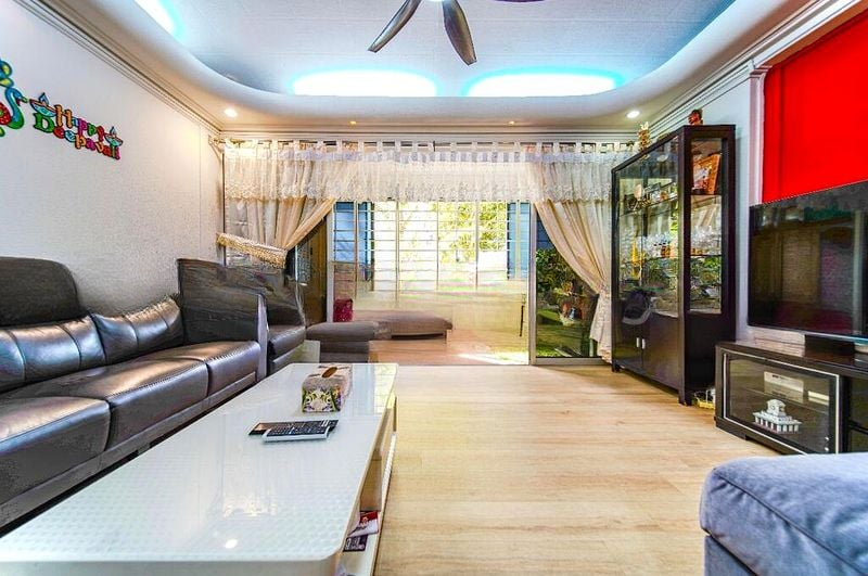 Step into a bright and airy sanctuary at 113 Bedok Reservoir Rd, where modern finishes and abundant natural light create an inviting atmosphere. The spacious living room, adorned with recessed lighting and a large window, offers views of lush greenery, making it a perfect spot for relaxation.