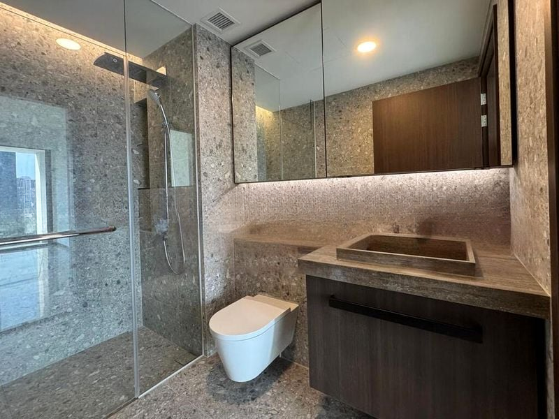Step into a brand-new sanctuary at ONE PEARL BANK, where modern minimalist design meets comfort. The moment you enter, you are greeted by the elegance of terrazzo flooring that flows seamlessly throughout the unit. Large windows draped with grey curtains invite natural light, framing breathtaking views of the city skyline, creating an ambiance that is both tranquil and inspiring.