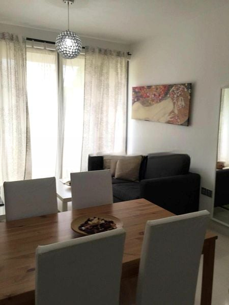 Step into a modern minimalist haven where natural light dances across glossy white cabinetry and wood parquet flooring. The spacious living area offers breathtaking views of the city skyline, while the private roof terrace beckons with a mosaic-tiled lap pool and inviting wooden decking, perfect for relaxation or entertaining.