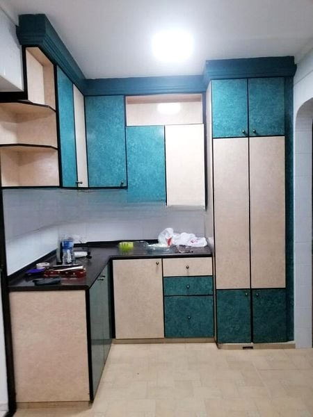 Step into this inviting 3-bedroom flat, where natural light dances across the tiled flooring, highlighting the elegant decorative crown molding and the warmth of the dark wood TV console. The living room exudes a functional yet lived-in ambiance, complemented by framed wall art that adds a personal touch. The balcony beckons with its red hanging egg chair, perfect for relaxation, while the pebble-patterned floor tiles create a serene outdoor retreat.