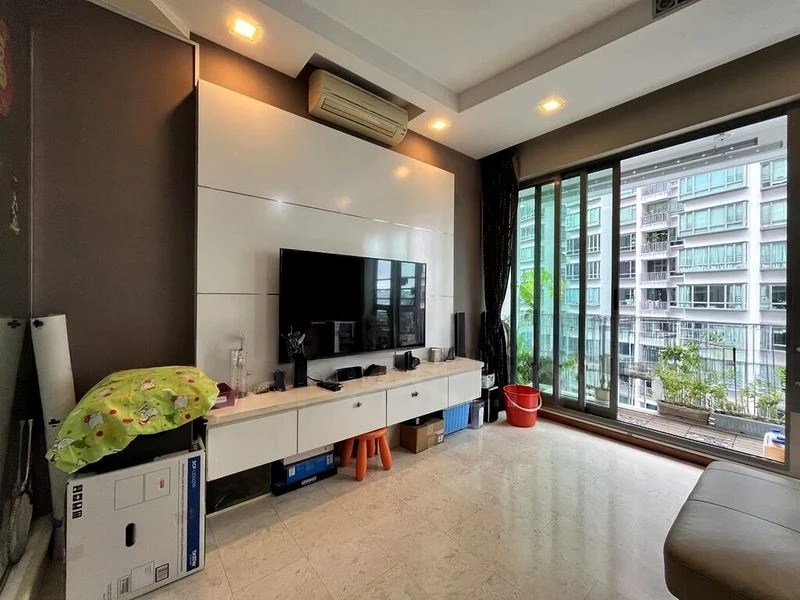 Step into a bright and airy sanctuary at The Quintet, where abundant natural light floods through floor-to-ceiling sliding glass doors, offering picturesque views of lush greenery and a nearby playground. The inviting ambiance is enhanced by elegant cove lighting and a modern chandelier, creating a warm and welcoming atmosphere.
