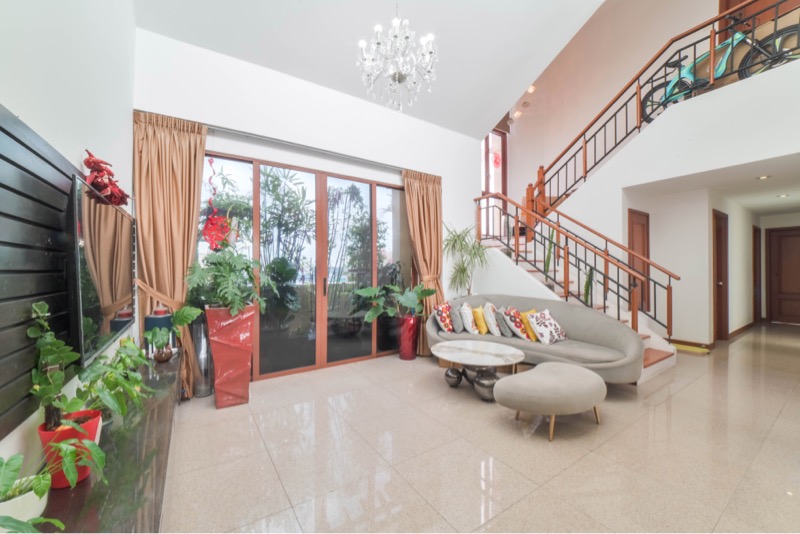Step into a sanctuary of light and space in this well-maintained 4-bedroom unit at Tropical Spring. The high ceilings and elegant chandelier create an inviting ambiance, while large glass sliding doors open to a spacious balcony adorned with lush potted plants, offering serene views of greenery. The marble-patterned wall tiles and wooden flooring enhance the unit's sophisticated charm, making it a perfect retreat for relaxation.