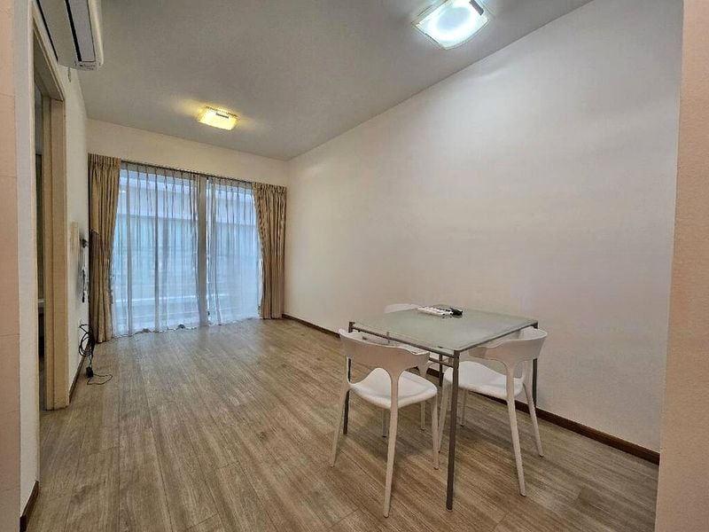 Step into a serene oasis at Parc Sophia, where modern minimalist design meets comfort. The moment you enter this well-maintained 1-bedroom unit, you are greeted by an abundance of natural light filtering through the glass railing of the balcony, showcasing stunning views of the pool and lush greenery. The ambiance is inviting, with white floor tiles and a contemporary feel that makes you feel right at home.