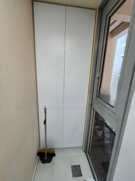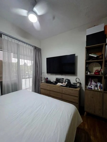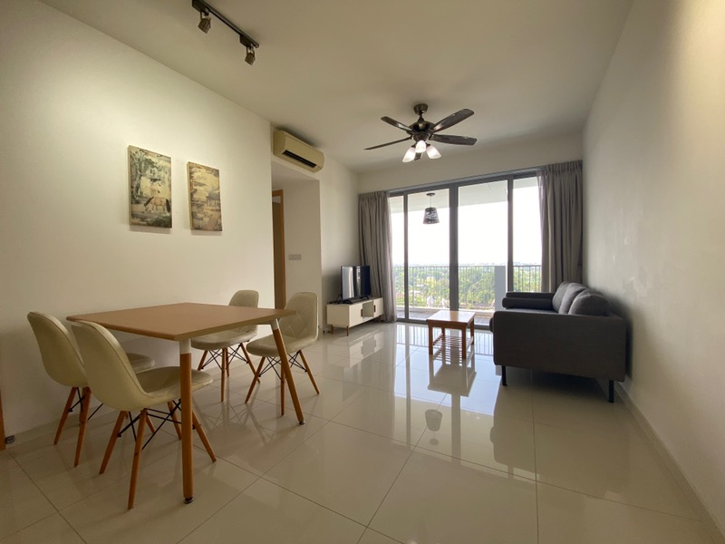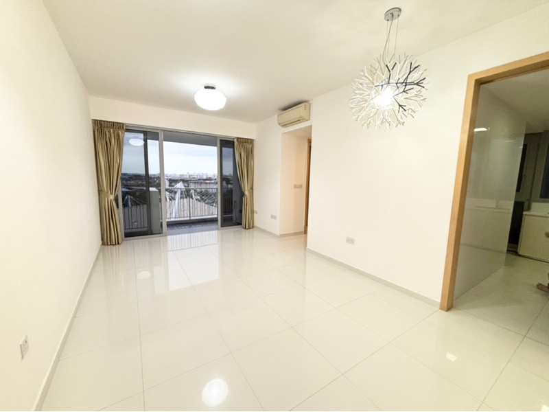 Step into a bright and airy sanctuary at The Estuary, where abundant natural light floods the space, accentuating the modern finishes and inviting ambiance. The living room, adorned with tiled flooring and a sleek TV feature wall with integrated lighting, seamlessly connects to a private balcony that offers unobstructed views of lush greenery and the tennis courts.