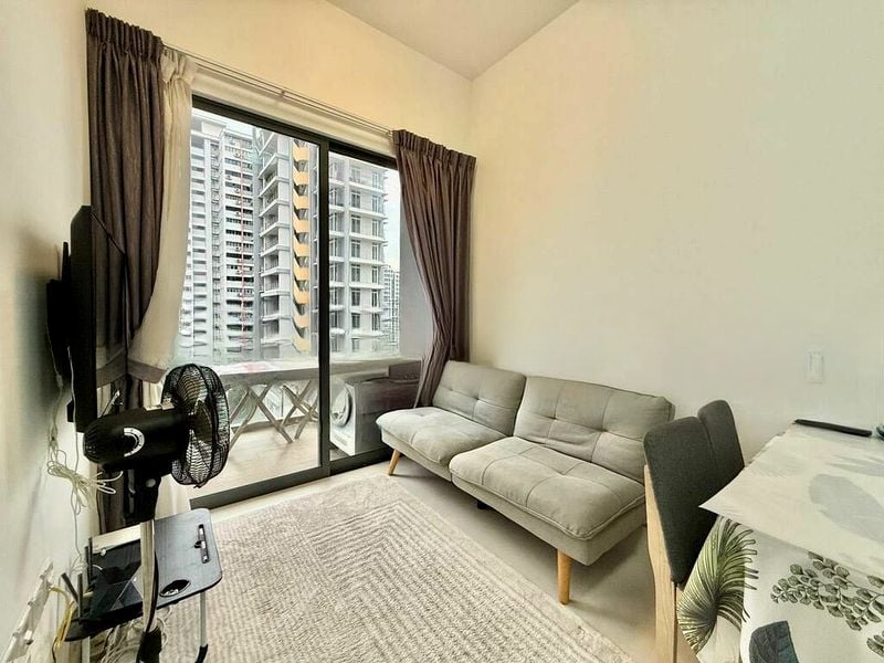 Step into a bright and airy sanctuary at Forte Suites, where abundant natural light floods the open-concept living space through floor-to-ceiling glass doors. The minimalist design, polished tile flooring, and seamless integration of the dining area create a welcoming ambiance, while the balcony offers breathtaking views of the city skyline and urban landscape, perfect for unwinding after a long day.