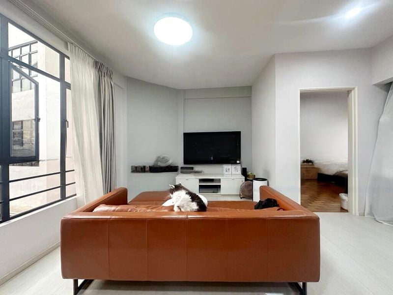 Step into a bright and airy sanctuary at CASA SARINA, where abundant natural light floods the spacious living area through large bay windows. The polished stone-look floor tiles reflect the warmth of the sun, creating an inviting ambiance that instantly makes you feel at home. Classic parquet flooring in the bedrooms adds a touch of elegance, while the views of lush greenery and surrounding residential buildings provide a serene backdrop.