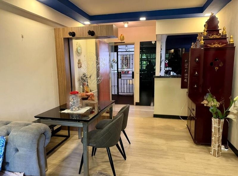Step into this inviting 4-bedroom flat where cozy ambiance meets functional living. The living room greets you with cove lighting that beautifully highlights the elegant broken marble flooring, while large windows draped in full-length curtains allow for moderate natural light to fill the space. Enjoy views of the surrounding residential buildings, creating a serene backdrop for your everyday life.