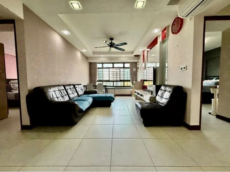 Step into this well-maintained 3-bedroom flat and feel the warmth of its simple yet functional ambiance. The living room welcomes you with moderate natural light cascading over the white tiled flooring, complemented by recessed ceiling lights that enhance the space. The open layout seamlessly connects the dining area, featuring a dark wood dining set and a stylish pendant light, creating an inviting atmosphere for family gatherings.