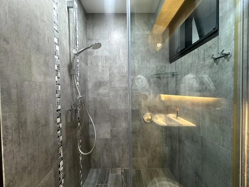 This well-laid-out 3-bedroom unit features a spacious living room with large format floor tiles and a full-wall built-in storage unit adorned with wood accents. Each bedroom boasts a built-in white wardrobe and under-window storage cabinets, ensuring ample space for your belongings. The bathrooms, while dated, offer a unique charm with their pink pedestal sink and two-tone wall tiling, providing a canvas for your renovation ideas.
