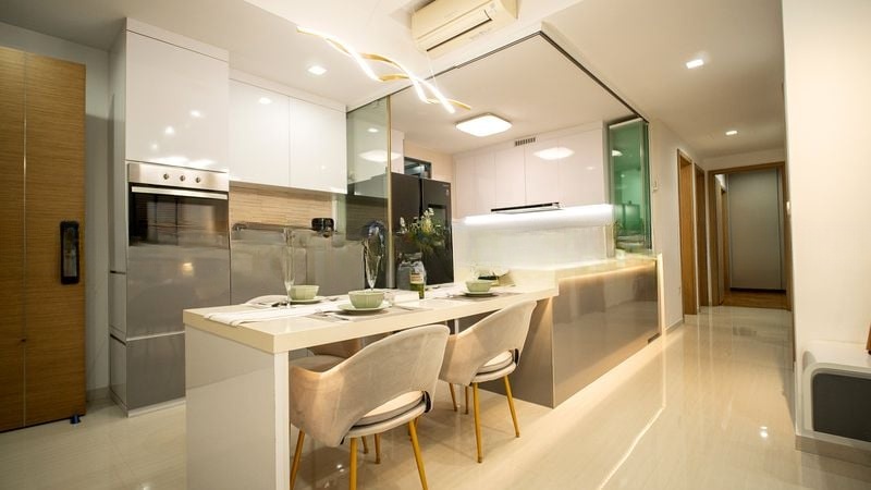 This well-maintained 3-bedroom, 3-bathroom unit boasts standout features, including a stylish kitchen with white high-gloss cabinetry, an integrated oven, and a dining counter perfect for entertaining. The large enclosed balcony extends your living space, equipped with ceiling fans and an outdoor dining area, ideal for alfresco meals. Every detail, from the designer wavy pendant light to the glass partition in the kitchen, reflects quality craftsmanship and thoughtful design.