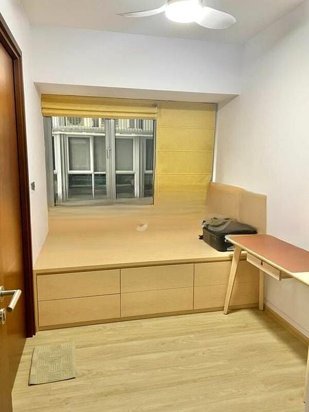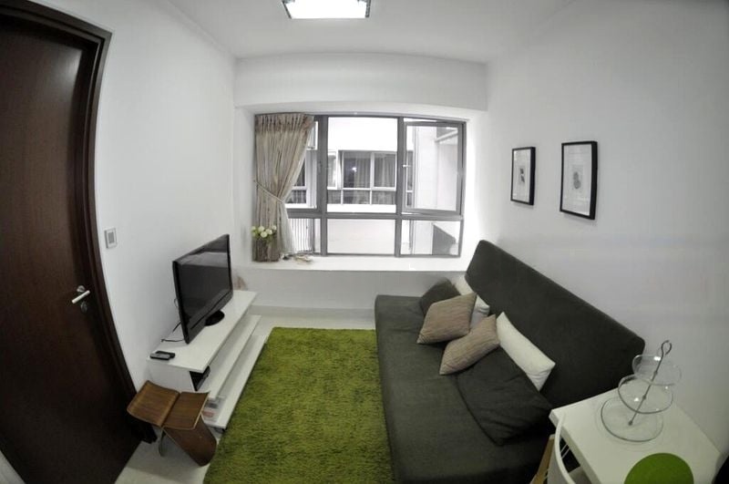 This one-bedroom unit is thoughtfully designed for both functionality and aesthetics. The modern kitchen is equipped with an induction hob and integrated cabinetry, perfect for culinary enthusiasts. The cozy living room, complete with a sofa bed and window ledge, offers a versatile space for relaxation or entertaining. The bedroom comfortably fits a queen-sized bed, adorned with full-length curtains that provide an elegant touch to the neutral walls.