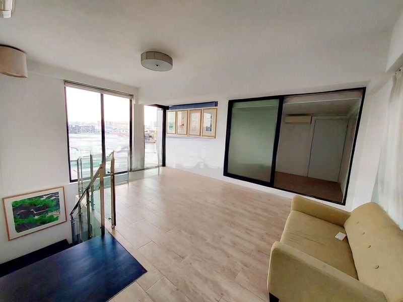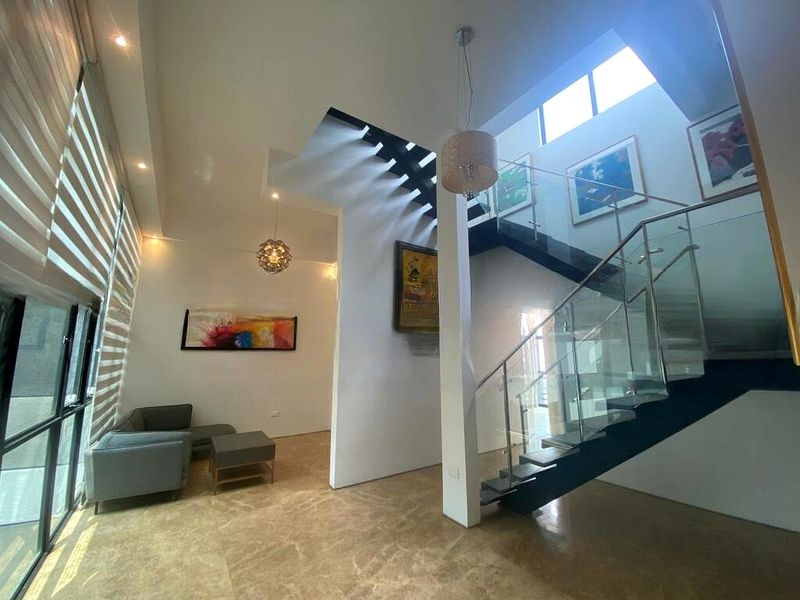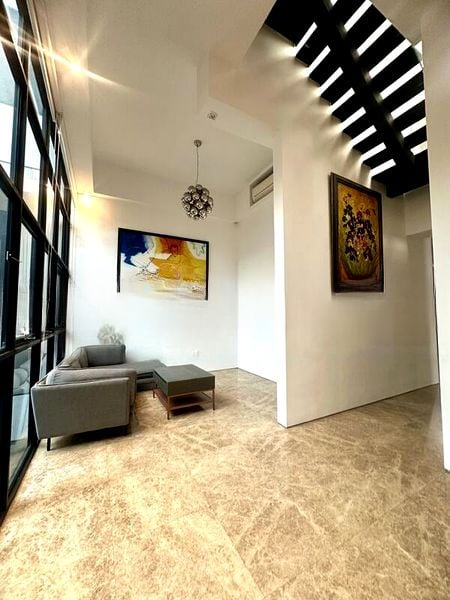 Step into a world of elegance as you enter this designer 4-bedroom unit at CUBIK, where abundant natural light floods the space through floor-to-ceiling windows, illuminating the marble-look flooring and creating a bright, airy ambiance. The double volume ceiling in the living room enhances the sense of space, complemented by a striking glass staircase railing and modern pendant lighting that adds a touch of sophistication.