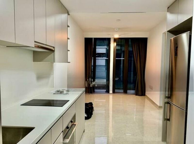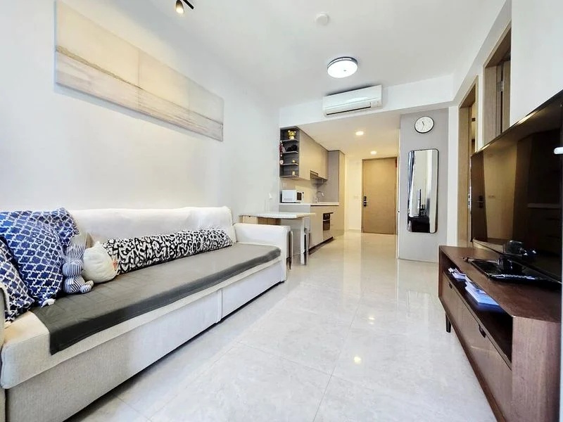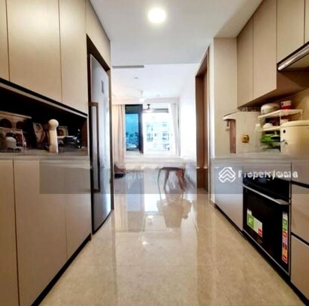 Step into this beautifully renovated 2-bedroom unit at The Tapestry, where modern minimalist design meets comfort. The open-concept living and dining area welcomes you with its tiled flooring and large wall art, creating an inviting ambiance filled with natural light. Enjoy stunning views of the city skyline from the bedroom, complemented by a built-in sliding wardrobe that maximizes space.