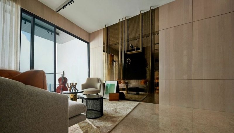 This thoughtfully designed 1-bedroom unit boasts exquisite finishes, including a vertical fluted feature wall in the living room and elegant marble-look flooring. The integrated kitchen is a chef's dream, equipped with built-in double ovens and light wood cabinetry, seamlessly blending style and functionality. The bedroom offers a serene retreat with wood wall paneling and designer pendant lights, ensuring comfort and elegance.