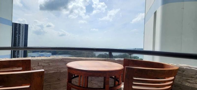 Step into a world of elegance and tranquility as you enter this beautifully renovated 2-bedroom unit at Mandarin Gardens. Bathed in natural light, the open living area features an elevated wooden platform and floor-to-ceiling glass sliding doors that frame unobstructed sea views, creating a serene ambiance. The mirrored walls enhance the spacious feel, making this home a perfect retreat.