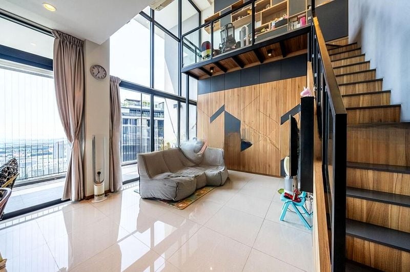 Step into a world of elegance and sophistication in this beautifully designed unit at The Trilinq. The moment you enter, you are greeted by an abundance of natural light pouring through the floor-to-ceiling windows, illuminating the double-volume high ceiling and creating a bright, airy ambiance. The custom wooden feature wall adds a touch of warmth, while the views of the city skyline provide a stunning backdrop to your daily life.