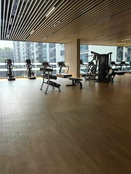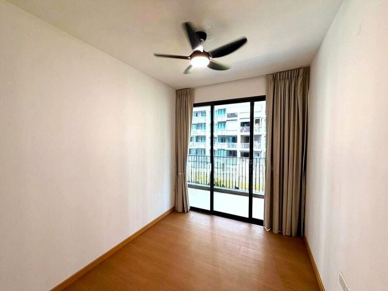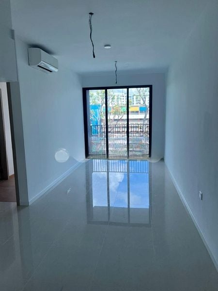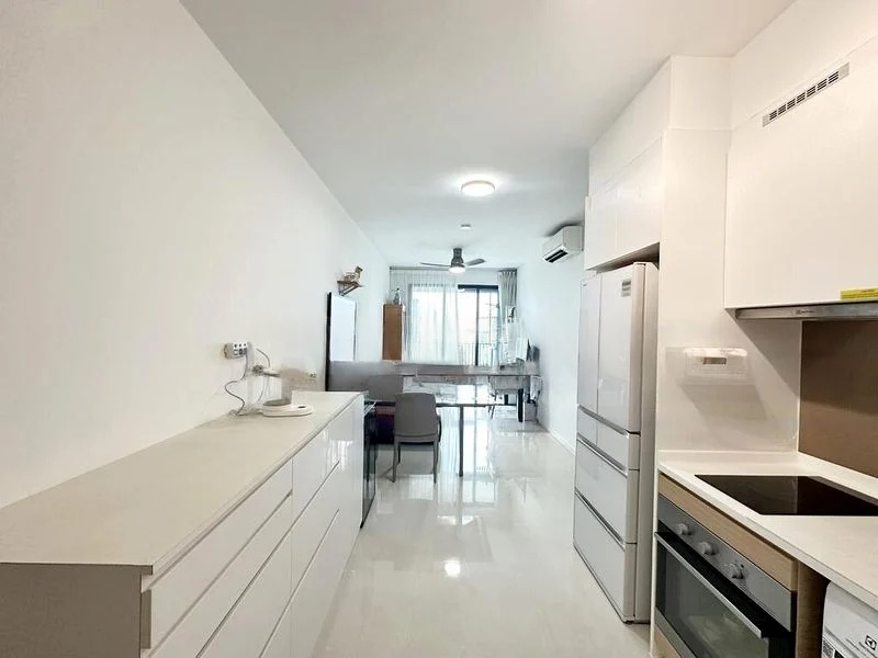 Step into a world of modern elegance as you enter this brand-new 3-bedroom unit at Treasure at Tampines. The designer finishes and thoughtful layout create a warm and inviting ambiance, enhanced by natural light filtering through floor-to-ceiling curtains. Enjoy serene views of lush greenery from your living room, where a stylish white fabric sofa and patterned area rug beckon relaxation.