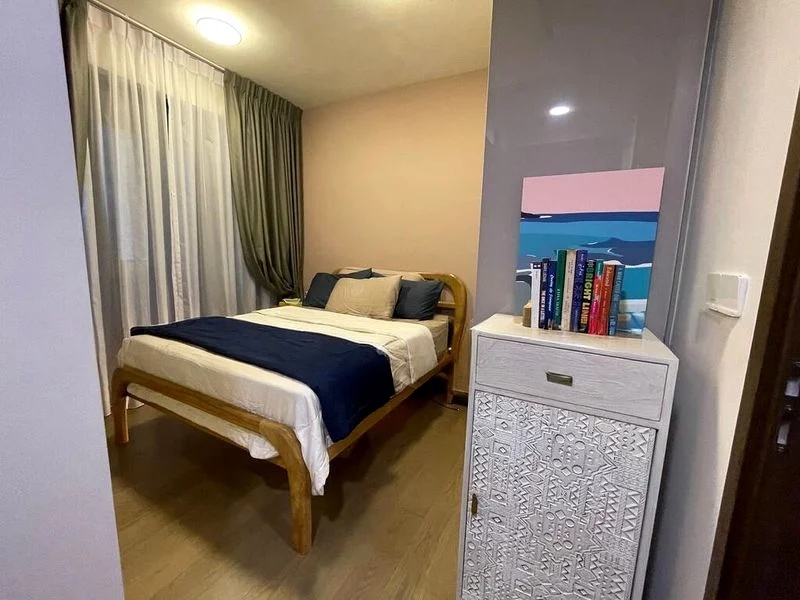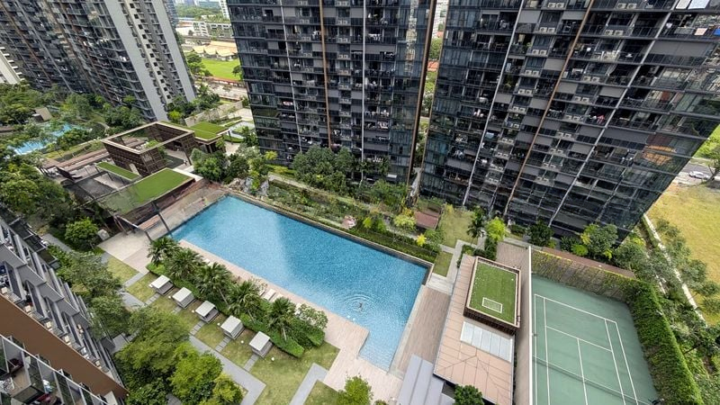 Step into this beautifully designed 2-bedroom unit at Parc Esta, where abundant natural light floods the space, highlighting the modern minimalist finishes. The open-concept living area, adorned with cove lighting and a stylish upright piano, seamlessly connects to a glass-railed balcony that offers unobstructed views of the lush greenery and the inviting pool below.