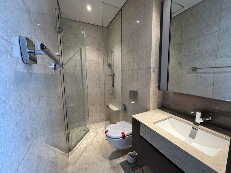 This well-maintained 4-bedroom unit boasts standout features including a master bathroom with a freestanding bathtub and double vanity, as well as a walk-in closet with floor-to-ceiling louvered wardrobes. The living room is a chic retreat, adorned with dark textured wallpaper and a low wooden console, while the children's bedroom offers a playful touch with twin beds and a vibrant mural. Each bathroom is designed for comfort, featuring rain showers and elegant stone-look tiles.