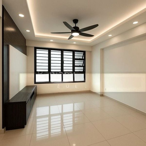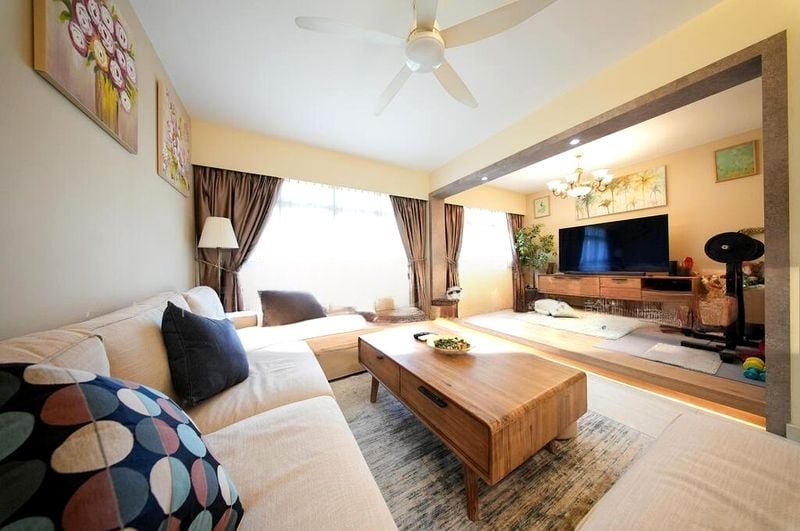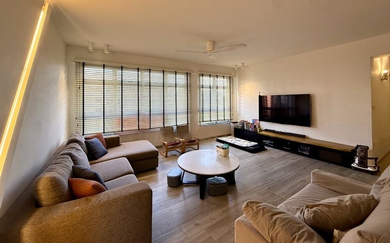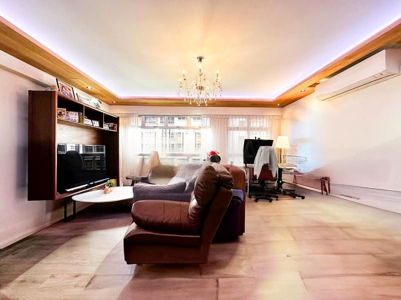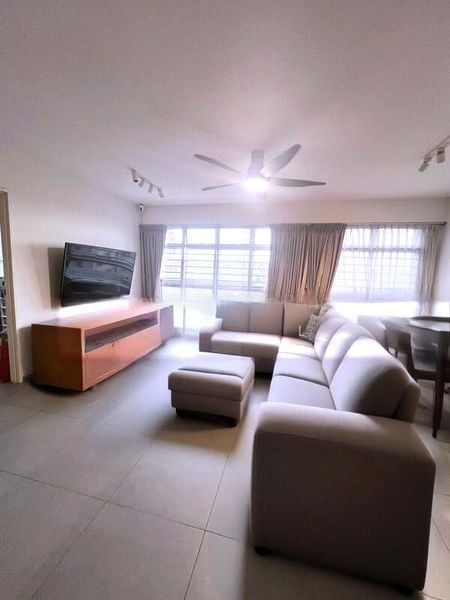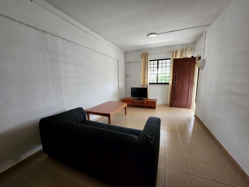 Step into this well-maintained HDB flat and feel the welcoming ambiance that greets you. The moderate natural light filters through the windows, illuminating the functional layout and original finishes. Enjoy urban views from the comfort of your living room, where a black fabric sofa and wooden coffee table create a cozy setting for relaxation.