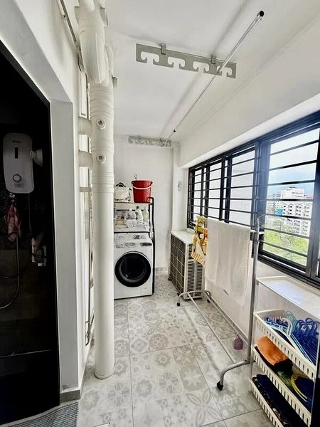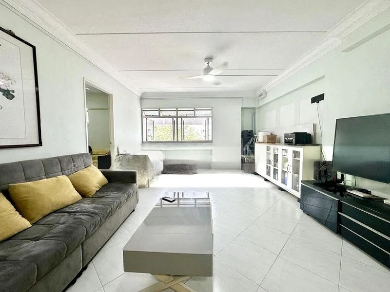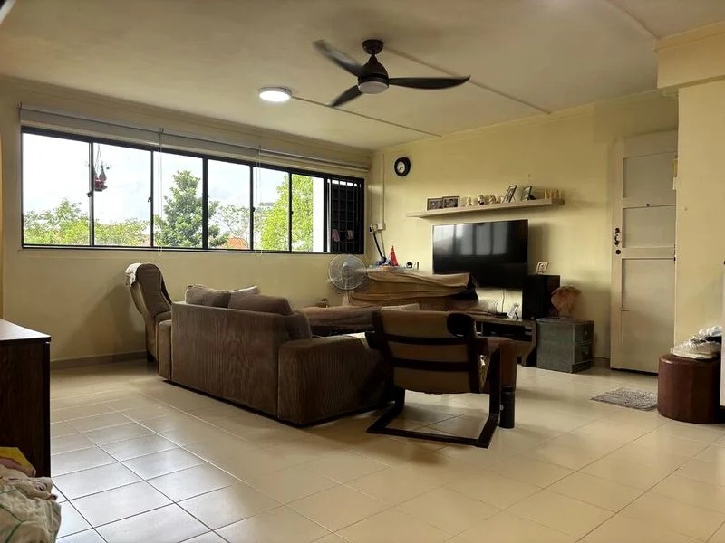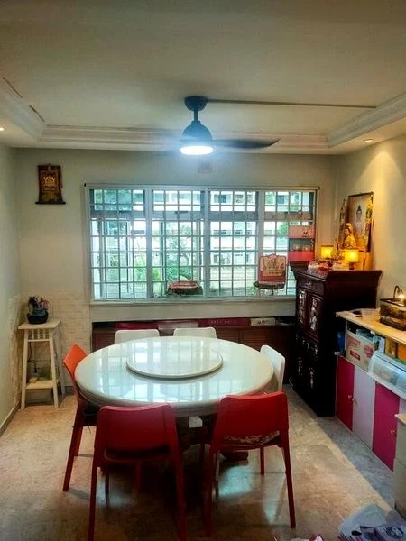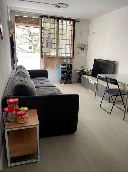 Step into this 2-bedroom HDB flat and be greeted by the warmth of herringbone parquet flooring that flows through the bedrooms, complemented by moderate natural light filtering in through the window grilles. The original finishes evoke a sense of nostalgia, while the classic blue wall tiles in the wet areas add a unique character to the space.