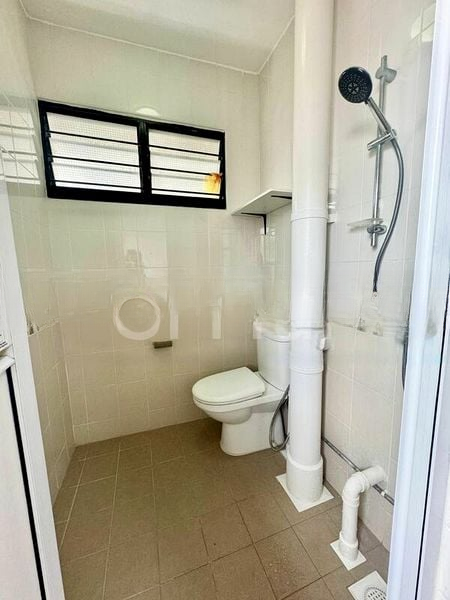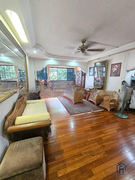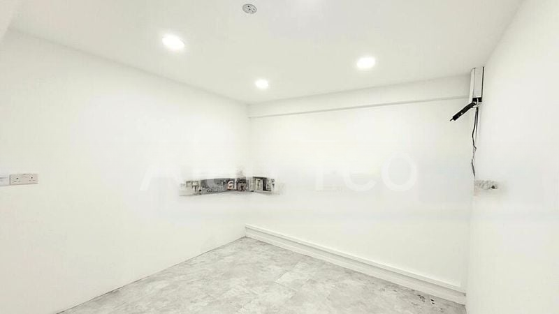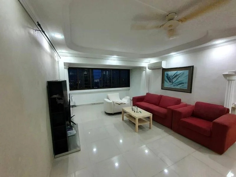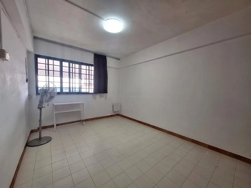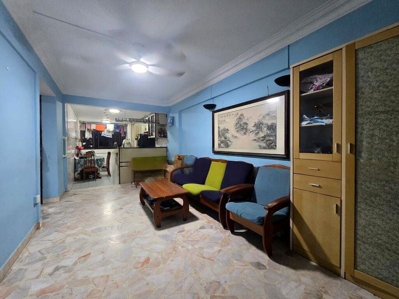 Step into a world of potential with this spacious 2-bedroom HDB flat, where the charm of original terrazzo flooring meets the warmth of blue walls. The living room invites you in with its functional layout, adorned with a wooden sofa set and large framed artwork, while tall display cabinets add a touch of elegance. Natural light may be limited, but the serene views of the landscaped park and gazebo create a tranquil ambiance that feels like home.