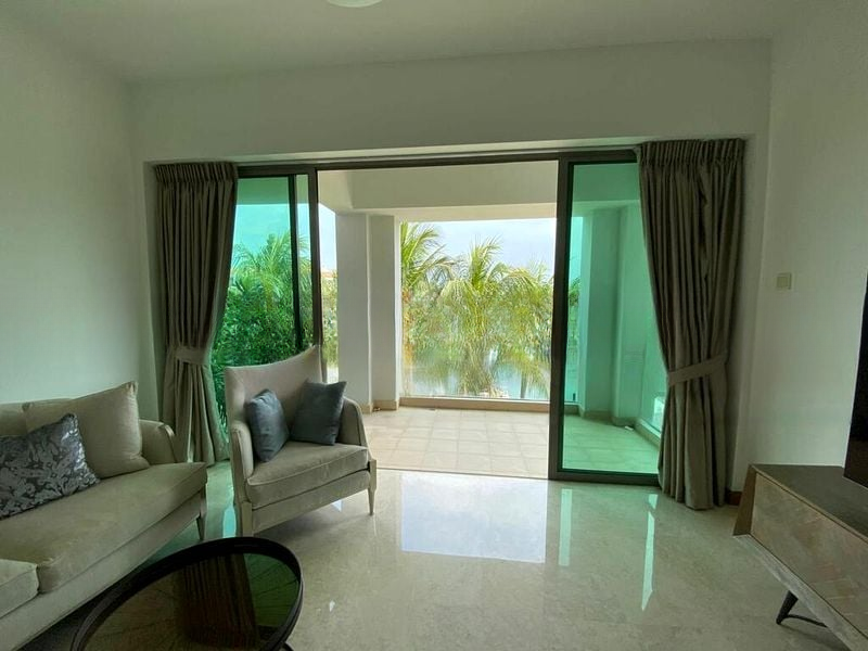 Step into a bright and airy sanctuary where abundant natural light pours through large glass sliding doors, illuminating the elegant marble flooring. The dual balconies offer stunning views of lush greenery and serene water, creating a tranquil ambiance that invites relaxation and enjoyment.