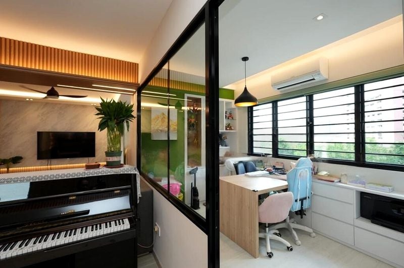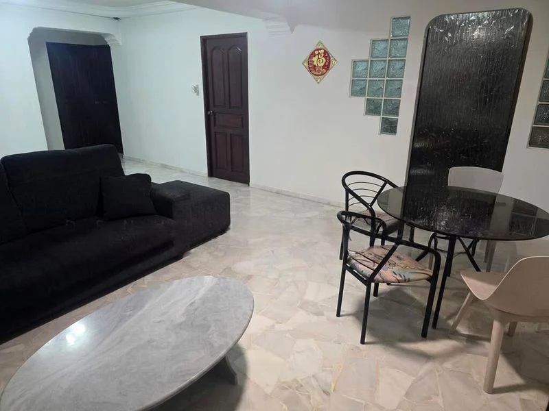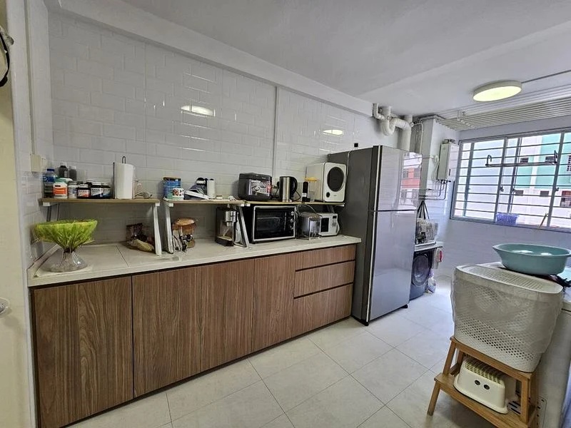 Step into this inviting 3-bedroom flat at Jurong West, where a warm ambiance greets you with its cozy, well-maintained interiors. The spacious open-plan living and dining area, adorned with tiled flooring and a large L-shaped leather sofa, is bathed in natural light, creating a welcoming atmosphere. Enjoy views of neighboring blocks and lush greenery from your windows, enhancing the serene living experience.