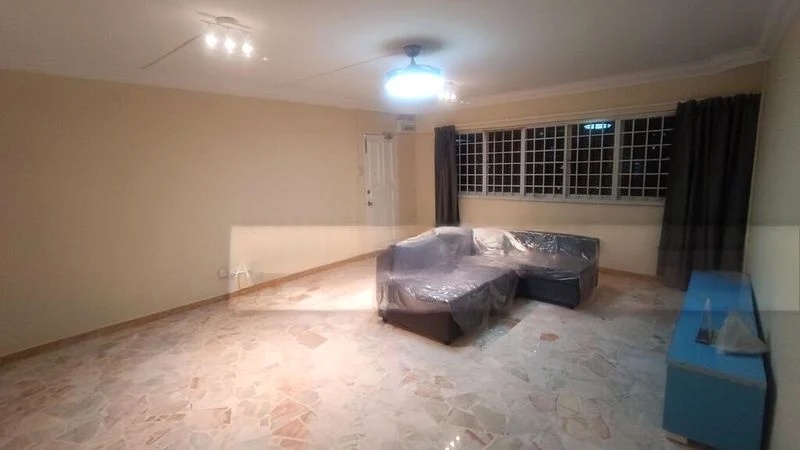 Step into a world of retro charm where classic terrazzo flooring greets you, complemented by an inviting ambiance that fills the spacious living area. The arched doorway leads you through a home that balances nostalgia with comfort, while large windows offer glimpses of the urban landscape and HDB blocks outside, creating a unique connection with the vibrant surroundings.