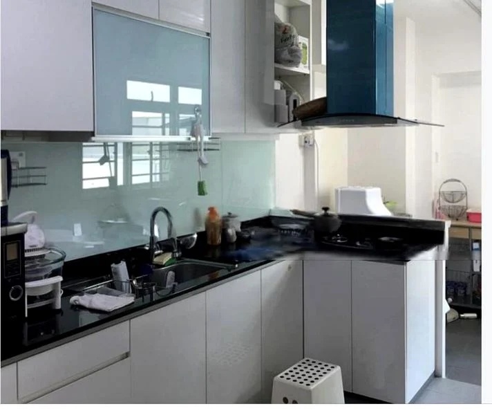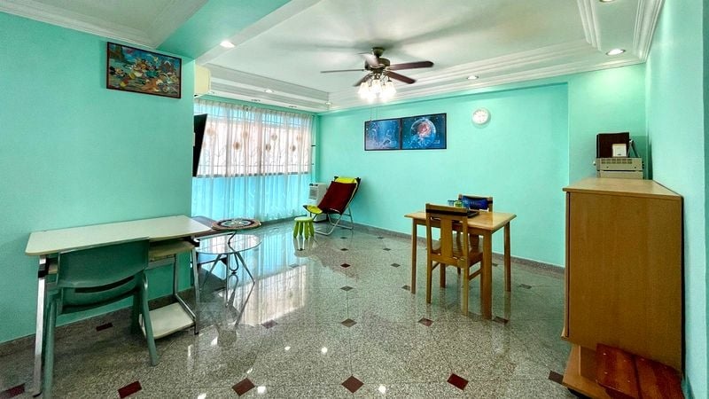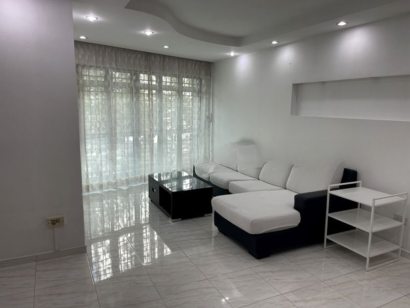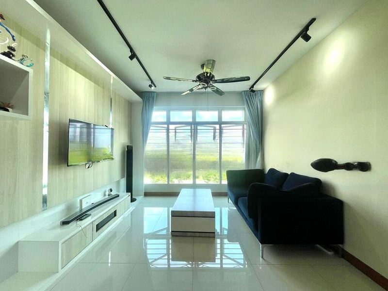 Step into this well-maintained 3-bedroom unit at 109A Edgedale Plains, where the inviting ambiance is accentuated by the warm tones of burl wood cabinetry and the soft glow of recessed ceiling lights. The spacious living room, featuring an L-shaped sofa and large windows dressed in sheer curtains, creates a cozy yet functional atmosphere, perfect for relaxation or entertaining.