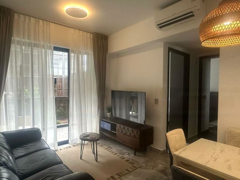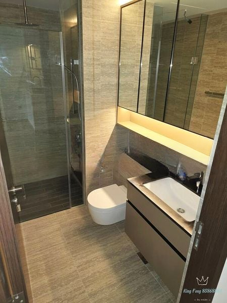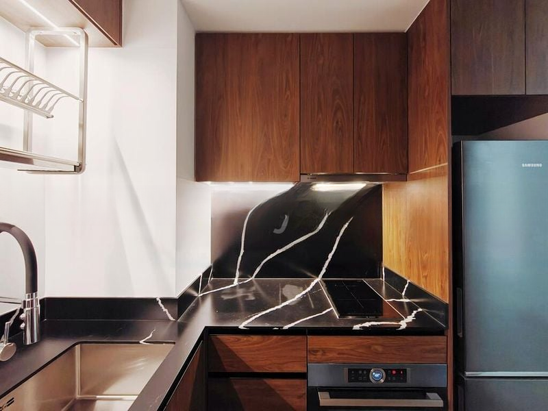 This stylish unit features a well-designed layout with two spacious bedrooms, both fitted with wood flooring and built-in sliding wardrobes. The kitchen is a culinary delight, showcasing dark wood cabinetry and a striking black marble backsplash, complemented by a built-in oven and integrated shelving. The bathrooms are equally impressive, featuring a luxurious rain shower, a wall-hung toilet, and a mirror cabinet with under-lighting, all finished with elegant stone-look tiles.