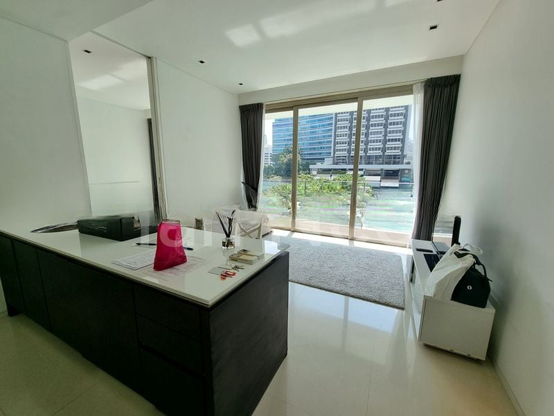 Step into a world of modern elegance as you enter this beautifully renovated 1-bedroom unit at Scotts Square. The abundant natural light floods through the floor-to-ceiling sliding glass doors, illuminating the sleek high-gloss cabinetry and minimalist aesthetic. Enjoy breathtaking views of the city skyline and lush greenery from the comfort of your living area, creating a serene ambiance that invites relaxation.
