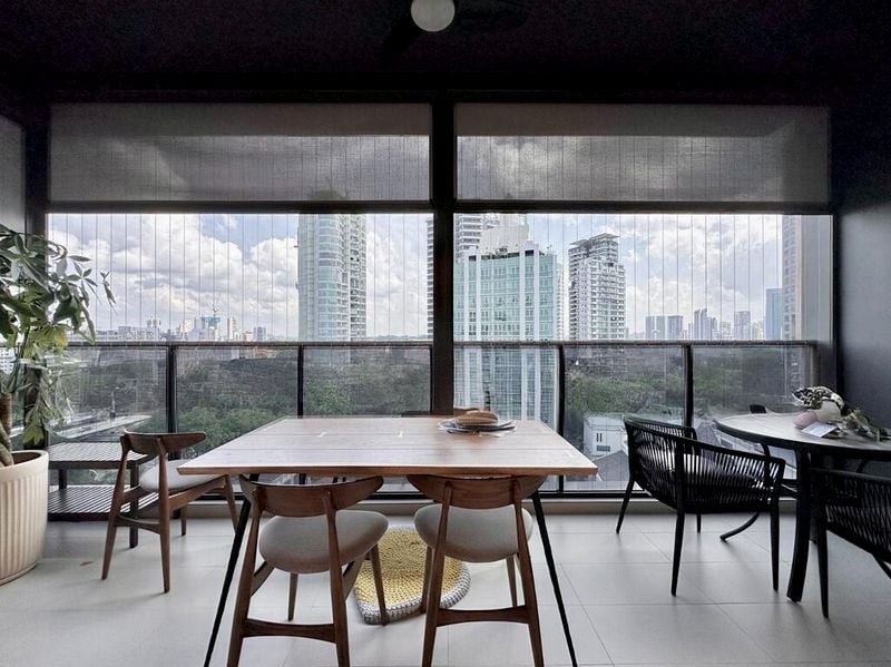 Step into a beautifully renovated sanctuary where abundant natural light floods the open-concept living and dining area, accentuating the modern minimalist ambiance. Floor-to-ceiling sliding glass doors lead to a private balcony, offering stunning views of the city skyline and neighboring buildings, creating an inviting space for relaxation and entertainment.