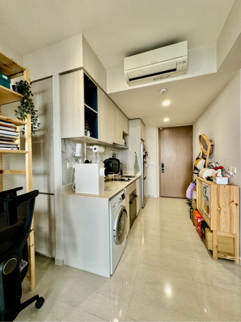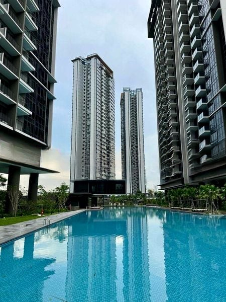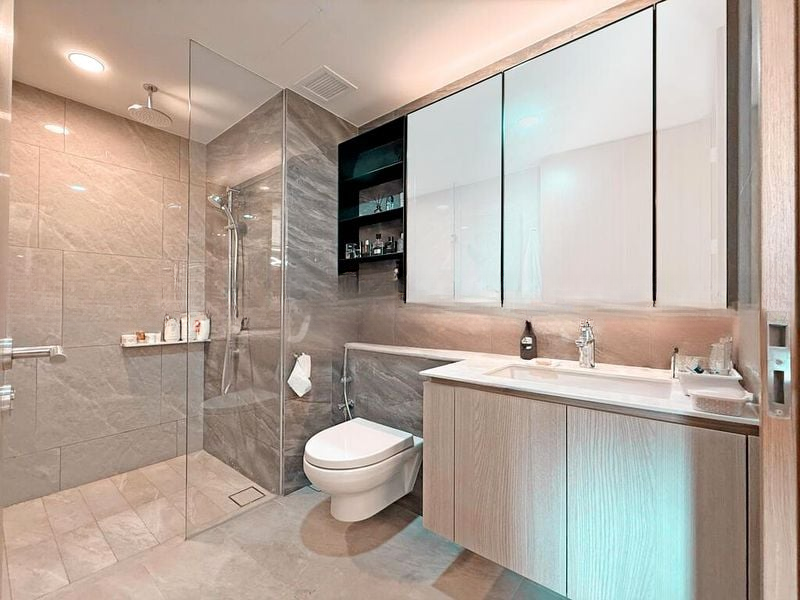 Step into a bright and airy haven at Whistler Grand, where abundant natural light floods the open-concept living space. The white tiled flooring and glass balcony railing create a seamless connection with the breathtaking unblocked views of the city skyline and lush greenery, making every moment spent here feel extraordinary.