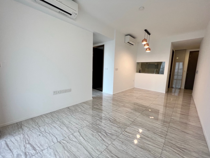 This efficient 1-bedroom plus study layout is thoughtfully designed for modern living. The spacious living area connects effortlessly to the integrated kitchen, featuring minimalist cabinetry and a breakfast bar perfect for casual dining. The dedicated study area, conveniently located next to the master bedroom, offers flexibility for work or relaxation. The master bedroom boasts built-in floor-to-ceiling wardrobes and warm accent lighting, complemented by a large window dressed in sheer curtains.
