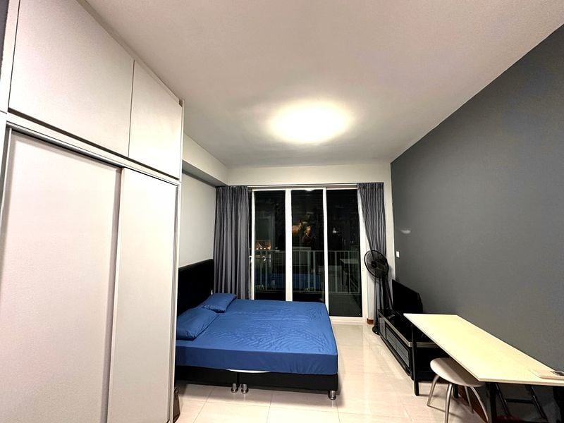 Step into a beautifully designed space where modern minimalism meets comfort. The well-maintained unit greets you with a stunning white brick feature wall and circular recessed wall lighting that creates a warm ambiance. Floor-to-ceiling glass sliding doors in the master bedroom invite natural light and offer serene views of lush greenery, making every moment spent here feel tranquil and refreshing.