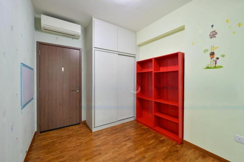 This spacious 2-bedroom, 2-bathroom unit boasts a thoughtful layout, featuring a stylish open-concept living and dining area that seamlessly flows into the galley kitchen. The kitchen is a chef's delight with marble-look countertops, minimalist cabinetry, and integrated appliances. The master bedroom is equipped with a platform bed frame and a built-in wardrobe, while the second bedroom doubles as a study with vibrant red bookshelves and wall decals, perfect for both relaxation and productivity.