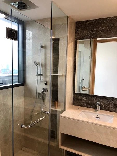 This efficient layout features an open-plan kitchen equipped with integrated appliances, including an induction hob and quartz countertops, perfect for culinary enthusiasts. The spacious bedroom offers a plush upholstered headboard and large windows that enhance the serene atmosphere. The bathroom boasts a luxurious marble-look feature wall, a rain shower, and a mirrored vanity cabinet, ensuring a spa-like experience at home.