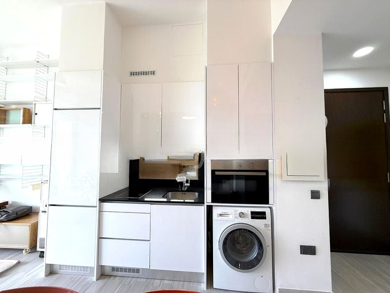 This 1-bedroom unit features standout elements such as glass sliding door partitions that enhance privacy while maintaining an airy feel. The integrated kitchen is a chef's dream, equipped with sleek white cabinetry, a black countertop, and top-of-the-line appliances, including an oven and front-load washing machine. The bathroom is a luxurious retreat, showcasing a rain shower, vessel sink, and wall-hung toilet, all complemented by textured wall tiles and a large vanity mirror.