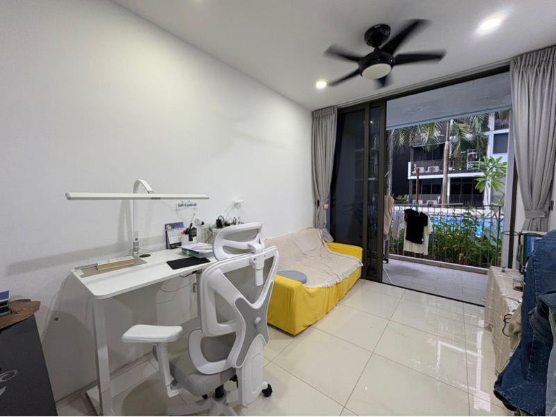 This thoughtfully designed 2-bedroom unit features a modern ergonomic study area, an integrated kitchen with sleek white cabinetry, and high-quality appliances including a built-in oven and induction hob. The minimalist bedroom design, complemented by wood-effect laminate flooring and full-height curtains, enhances the tranquil atmosphere. Residents can also enjoy full condo facilities, including a large swimming pool, landscaped gardens, and a well-equipped gym with a stunning glass facade.