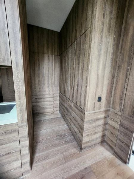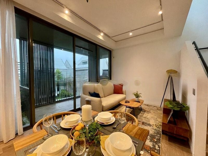 Step into a world of elegance as you enter this brand-new designer unit at 10 Evelyn. Bathed in abundant natural light, the open-concept living area features high vaulted ceilings and striking wood-paneled walls, creating a warm yet contemporary ambiance. Floor-to-ceiling sliding doors invite you to enjoy serene views of the lap pool and lush greenery, making every moment spent here feel like a retreat.