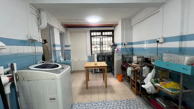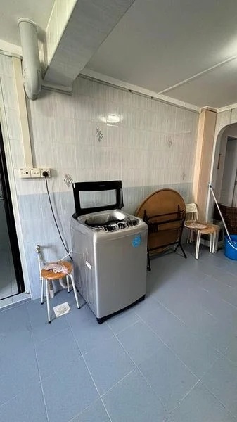 Step into a well-maintained 2-bedroom flat that exudes a simple yet functional ambiance. The neutral tiled flooring and grey-painted walls create a serene backdrop, while natural light filters through the window grilles, offering a glimpse of the neighboring HDB blocks. The living area, furnished with a woven rattan sofa, invites relaxation and comfort.