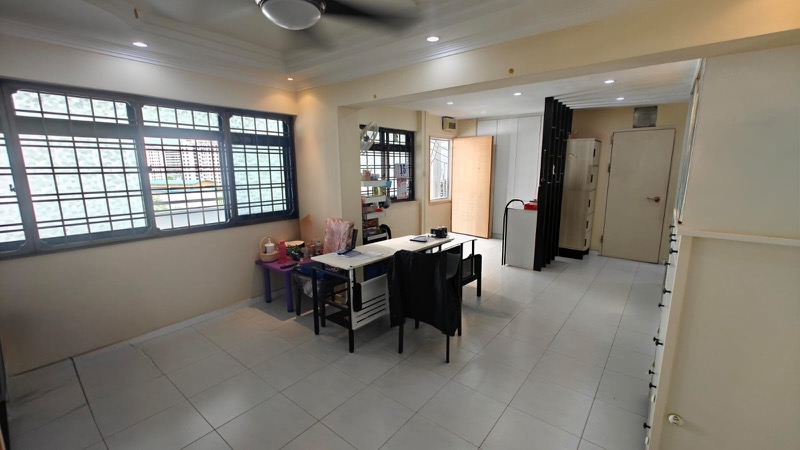 Step into a well-maintained oasis where polished marble flooring greets you, reflecting the soft glow from the recessed lighting in the spacious living room. The ambiance is functional yet inviting, enhanced by the unique blue bathroom fixtures that add a touch of character. Large windows invite natural light, offering a glimpse of the urban landscape and HDB blocks beyond.
