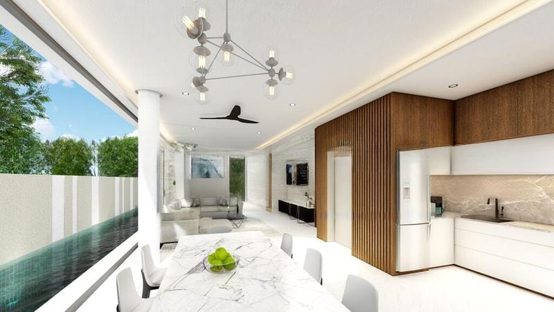 Step into a world of modern elegance as you enter this brand-new designer home. The open-concept living and dining area, adorned with pristine white marble flooring and floor-to-ceiling glass doors, invites abundant natural light and offers stunning views of the lush greenery and private lap pool. The ambiance is a perfect blend of minimalist sophistication, accentuated by a designer chandelier and wood-slat feature walls that create a warm yet contemporary feel.