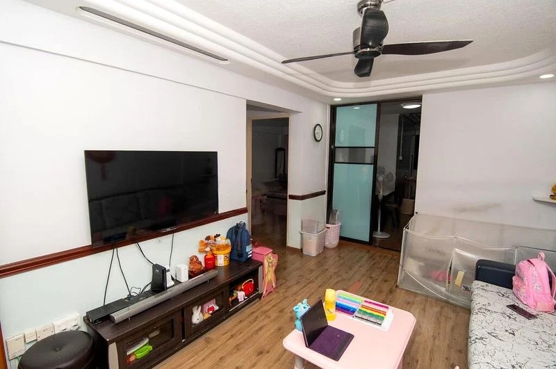This thoughtfully designed 2-bedroom flat boasts a spacious kitchen with light wood cabinetry and a glass-top dining table, perfect for entertaining. The integrated laundry drying rack adds practicality, while the fully tiled bathroom and large dark wood wardrobe in the bedroom ensure functionality without compromising style. With a total floor area of 688 sqft, this unit maximizes every inch for your comfort.