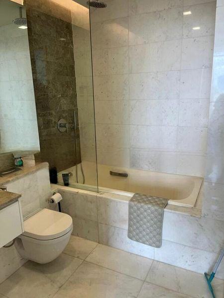This thoughtfully designed 2-bedroom, 2-bathroom unit features an open-concept living area that flows effortlessly into a modern kitchen equipped with integrated appliances and a stylish breakfast bar. The master bedroom boasts a built-in wardrobe and stunning views, while the bathrooms are adorned with luxurious finishes, including a rain shower, bathtub, and wall-hung toilets, ensuring a spa-like experience at home.