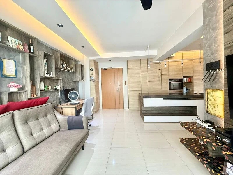Step into this beautifully renovated HDB flat and be greeted by a modern ambiance enhanced by thoughtful finishes. The open-concept living area is bathed in natural light, showcasing a sleek wooden TV console and an integrated study desk beneath a stylish false ceiling with cove lighting. The inviting dining area features a stunning wooden island table, perfect for gatherings, surrounded by extensive built-in storage that maximizes space and functionality.