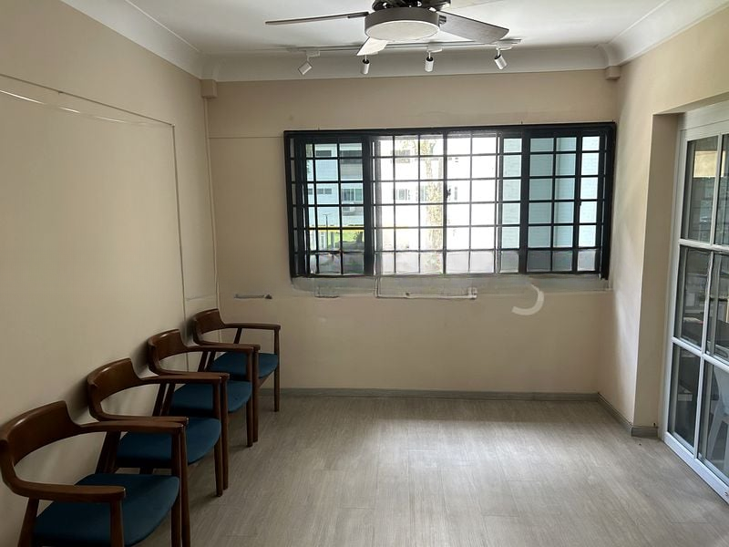 Step into this beautifully maintained HDB flat and be welcomed by an ambiance of modern minimalism. The open layout of the living room, adorned with track lighting and a stylish wooden blade ceiling fan, invites natural light to dance across the wood-look vinyl flooring. Large windows frame views of lush greenery and nearby residential buildings, creating a serene backdrop for your everyday life.
