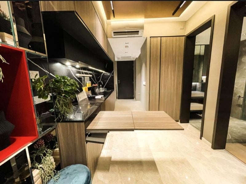 Step into a world of modern luxury as you enter this brand-new 5-bedroom unit at Irwell Hill Residences. Bathed in abundant natural light, the open-concept living area showcases a striking marble-look feature wall and dark wood paneling, creating an inviting ambiance. Floor-to-ceiling windows offer panoramic 180-degree views of the city skyline, including iconic landmarks like Marina Bay Sands and Orchard Road, making every moment spent here a visual delight.