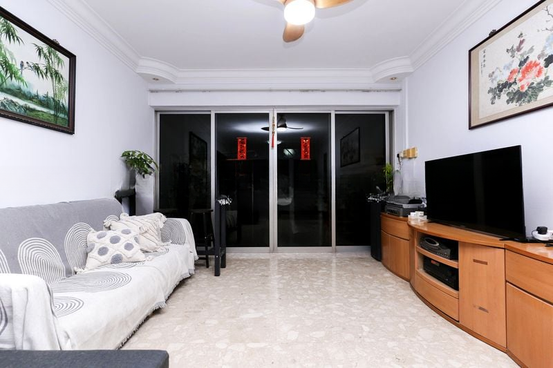 Step into a warm and inviting ambiance as you enter this well-maintained 4-bedroom HDB flat. The marble flooring in the living areas reflects the soft glow of natural light, while large sliding glass doors frame stunning night views, creating a perfect backdrop for relaxation and entertainment. The cozy atmosphere is enhanced by tasteful wall art and a ceiling fan that adds a touch of comfort.